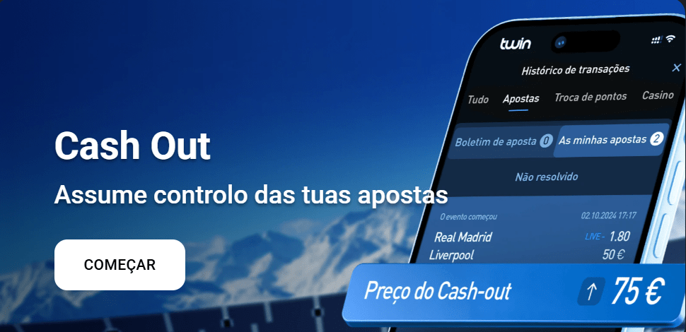 No final, o Cash Out torna cada aposta mais viva e cada momento mais eficaz. Na Casa de Apostas Twin, o jogo não é apenas para assistir – é participar em tempo real, com controlo total sobre cada momento. E este é só uma das fantásticas vantagens que a Twin coloca ao teu alcance, entre várias opções criadas para te dar mais liberdade ao apostar.